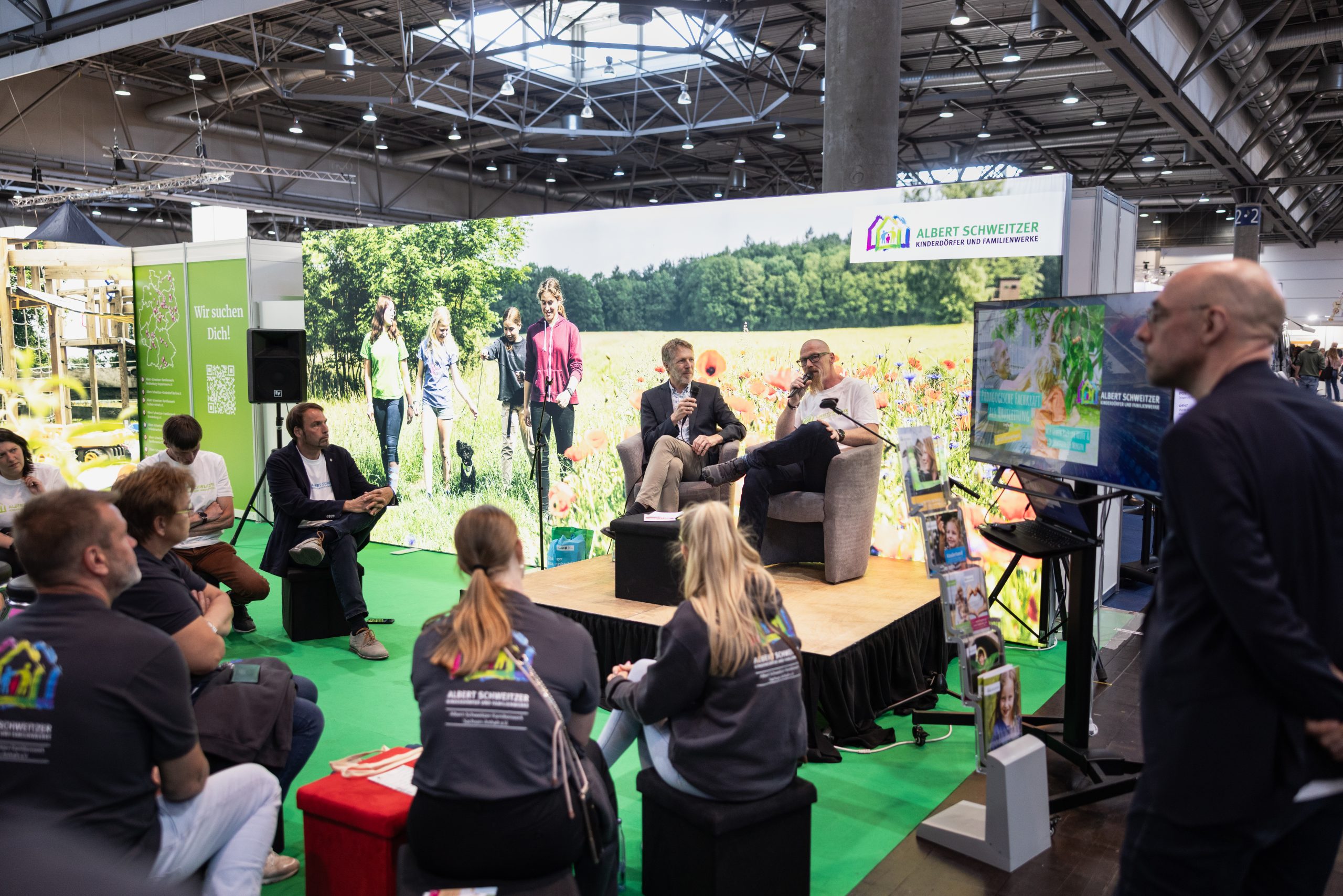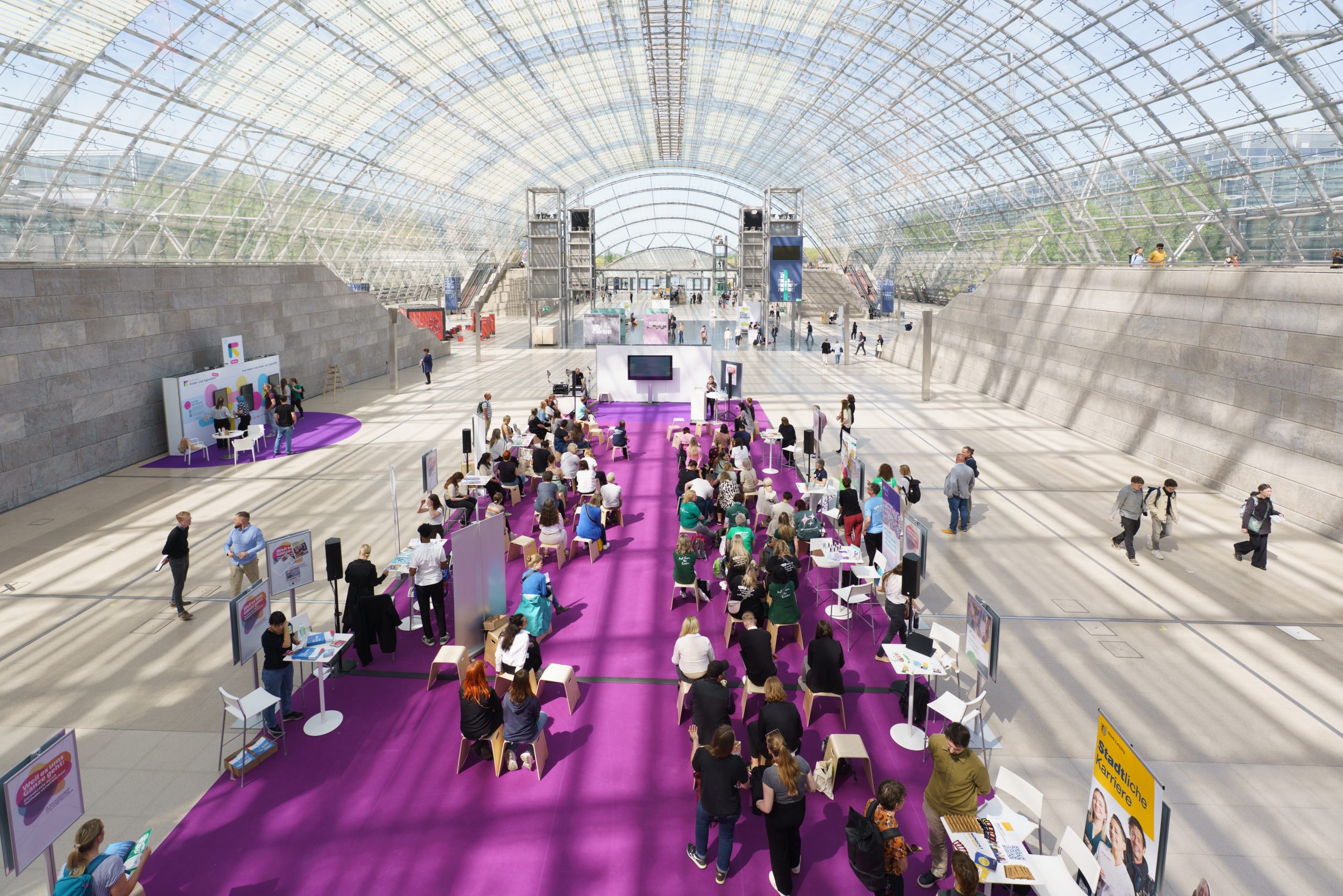 Fachkräftemangel? Forum Berufseinstieg! Zur Berufsorientierung, Berufseinmündung nach Ausbildung/ Studium und Seiten- und Quereinstieg gab es Impulsveranstaltungen und Austauschformate mit erfahrenen Fachkräften und „Peers“. (Potenzielle) Arbeitgeber*innen stellten sich ebenso vor wie Ausbildungs- und Studiengänge oder Anbieter von Freiwilligendiensten, Maßnahmen oder Praktika. Eine interaktive Jobwall informierte über zahlreiche aktuelle Stellenausschreibungen aus dem Berufsfeld der Kinder- und Jugendhilfe.
