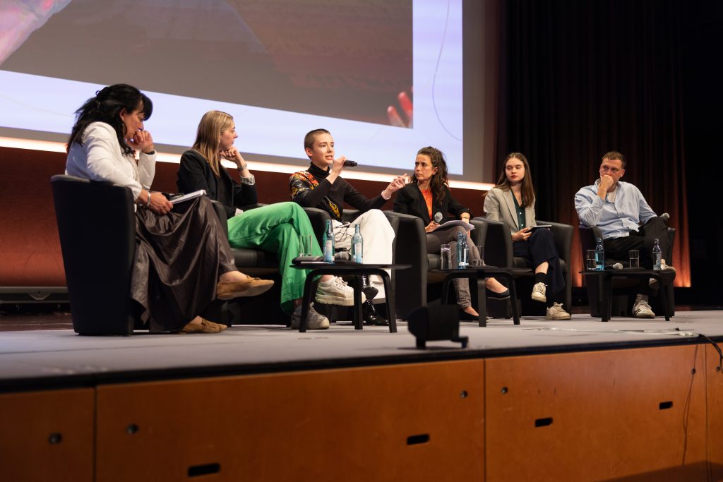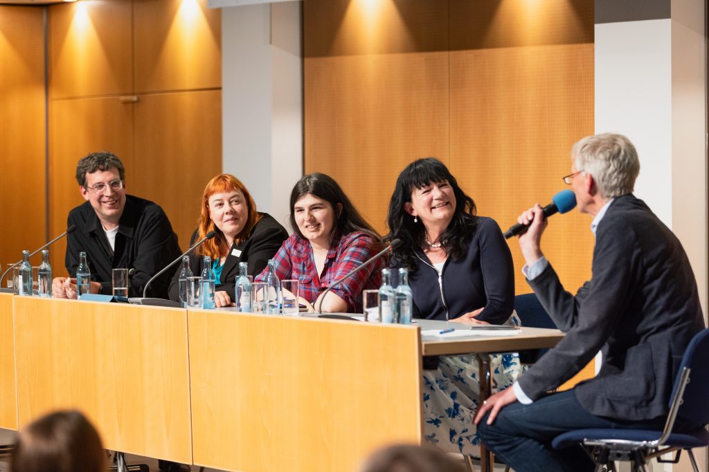 Foto (v.l.n.r.): Prof. Dr. Karin Böllert, Annika Fleischer, Marharyta Vorychava, Katharina Kühn (Moderation), Anna Holtkamp und Hendrik Bolz. | Fotograf: Stefan Walter